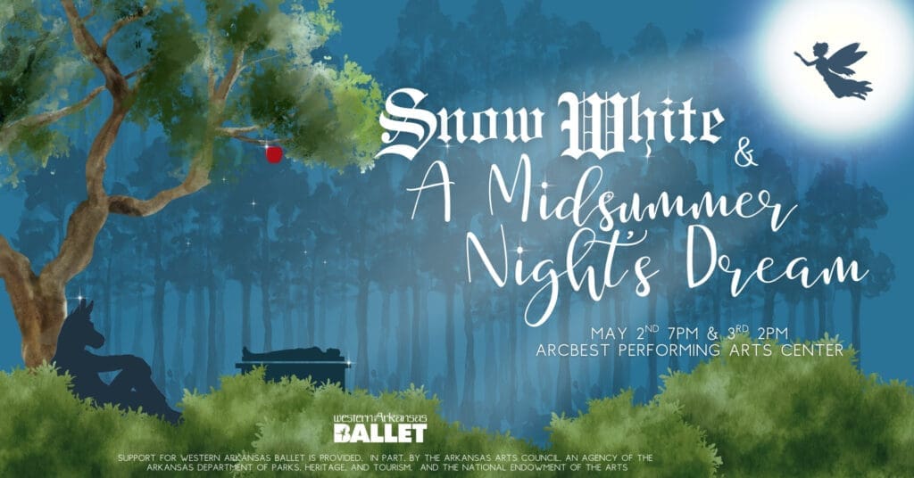 Get your tickets today! Snow White and A Midsummer Night’s Dream will be held at the ArcBest Corporation Performing Arts Center, 55 S. 7th Street, Fort Smith, on Saturday, May 2 at 7:00 p.m. and Sunday, May 3 at 2:00 p.m.