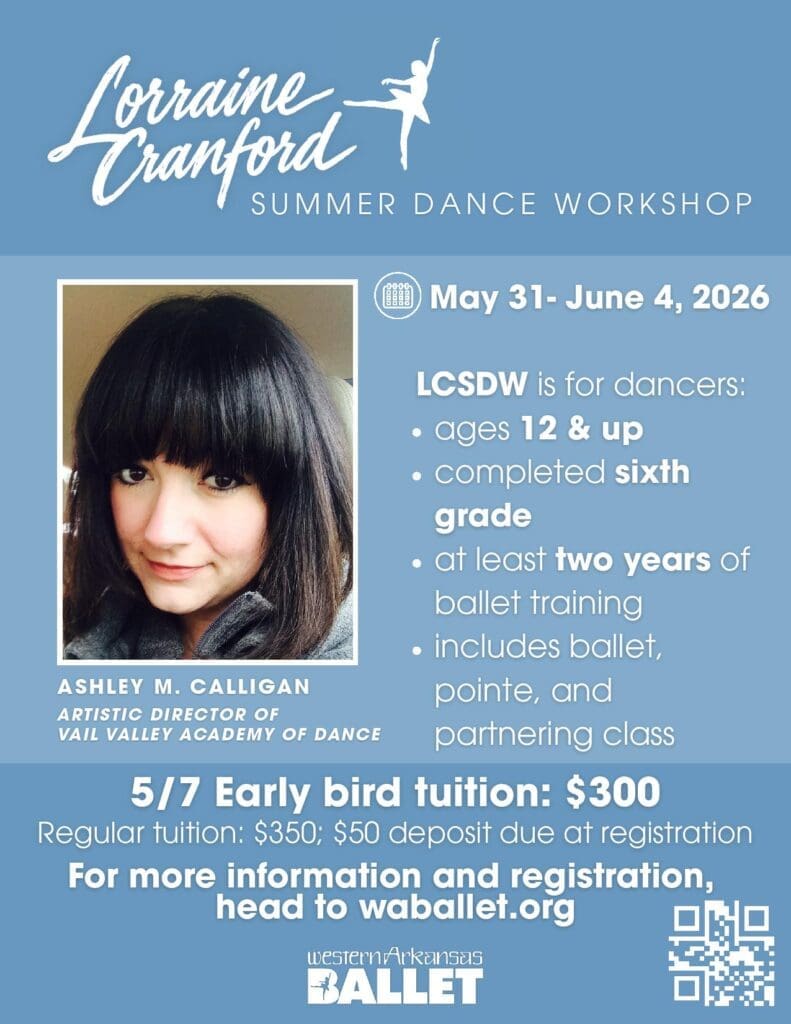 Western Arkansas Ballet is a nonprofit dance Academy and Regional Ballet Company located in Fort Smith, Arkansas, and dedicated to providing quality dance education and training in ballet, pointe, tap, jazz, hip-hop, modern, creative movement as well as adult classes in ballet & tap. Our focus on dance education and performance includes the whole community in two full-length performances each season.